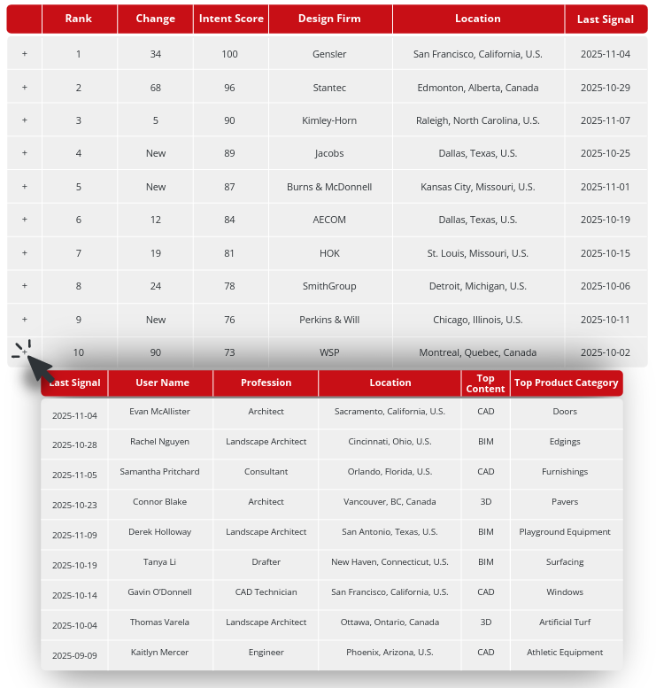 Natalia: We use a proprietary algorithm that analyzes the quality, quantity, and recency of AEC engagement with your products and related categories. It then assigns each firm an intent score and ranks the top 250 on your Design Firm Leaderboard, so you can instantly see which firms are most active and worth reaching out to. The leaderboard updates weekly, allowing you to track shifts in intent and help your team identify hot prospects or firms that may need a gentle nudge.