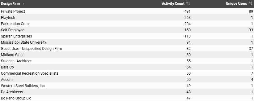 Under Users & Design Firms, you can view your desired Activity Metric (Pageviews, Clicks, or Downloads) based on unique users, user profession, and your top 15 active design firms.